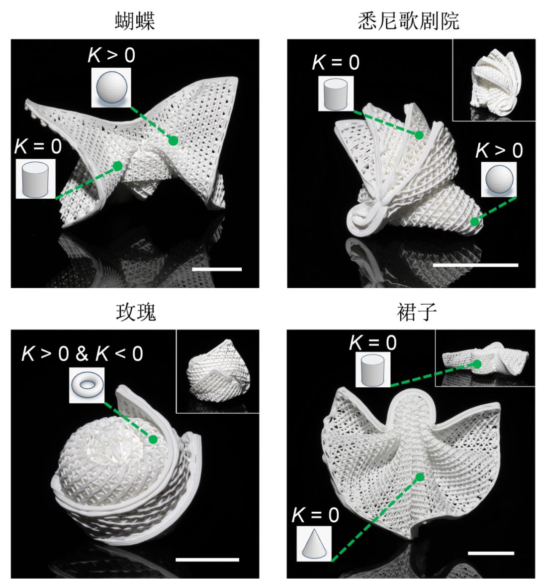 他们3D打印出有周期性三角形纹路填充的长方体预应变前驱体,构建了复杂陶瓷折纸结构,包括蝴蝶、悉尼歌剧院、玫瑰、和裙子。3D打印的弹性体经历形状转变, 并且被金属丝约束。弹性体中的周期性三角形纹路增强了整体结构的可折叠性,并且保证了金属丝约束的可编程性。