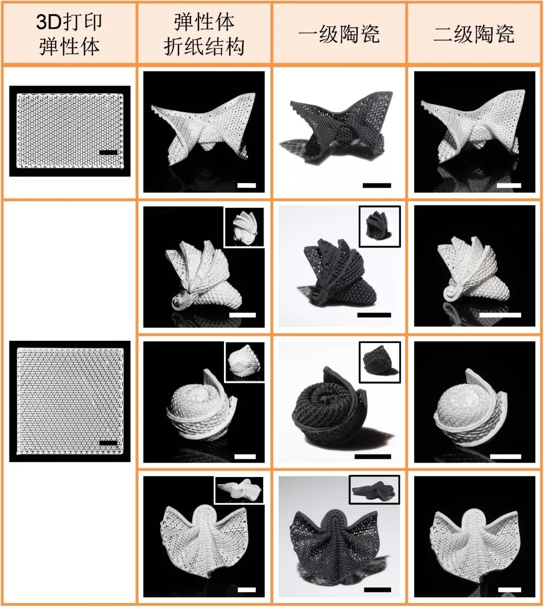 有鉴于此,吕坚教授研究组从材料出发,开发了不同系统的硅胶基质纳米复合弹性体材料作为陶瓷前驱体。这些弹性体材料的特性使其可以完成从3D打印到变形的过程,并且最终转变为陶瓷结构,从而逐步实现打印陶瓷折纸结构(Printed ceramic origami)和4D打印陶瓷 (4D printing of ceramics)。