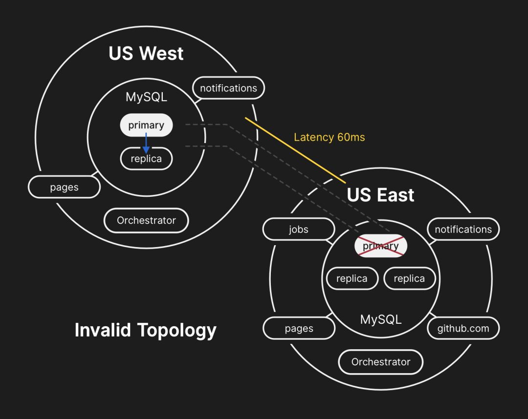 到23:02 UTC时,我们的第一响应团队的工程师已经确定许多数据库集群的拓扑处于意外状态。Orchestrator API的查询结果显示,数据库副本拓扑仅包含来自美国西海岸数据中心的服务器。