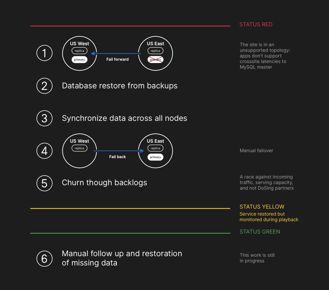参与事件响应团队的工程师开始制定解决数据不一致的计划,并实施MySQL的故障恢复程序。我们计划从备份还原,同步两个数据中心中的副本,退回到稳定的服务拓扑,再继续处理排队的作业。我们更新了状态,以通知用户我们将执行内部数据存储系统的受控故障恢复。