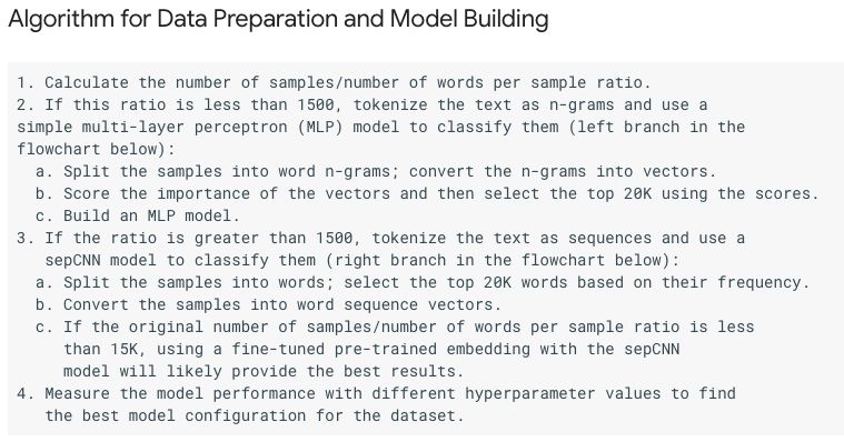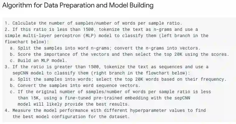 c. 如果原始样本数/每个样本的单词数这个比率小于15K,则使用微调的预训练sepCNN模型,可能得到最优的结果。