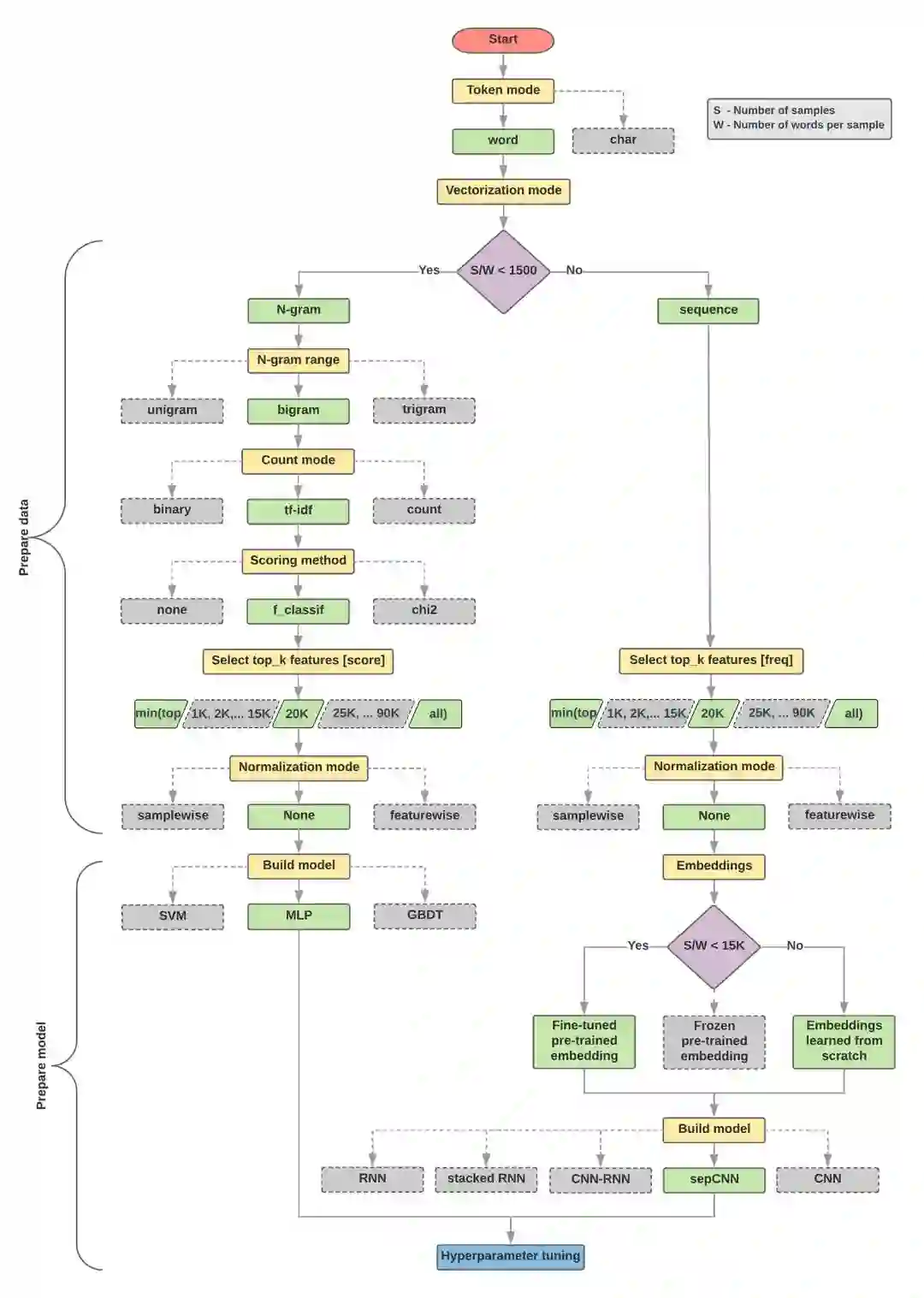 谷歌机器学习速成课程的《文本分类》指南详细解释了每个步骤,以及如何用文本数据实现这些步骤。由于篇幅限制,本文在涵盖重要的最佳实践和经验法则的基础上,重点介绍步骤2.5:如何根据数据集的统计结构选择正确的模型,并提供一个完整的流程图。