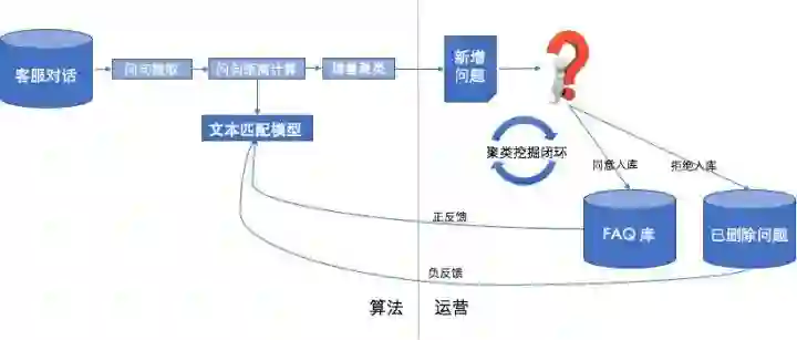 一种理想的 FAQ 库构建的流程应该是:从客服的直接对话出发,提取出与产品相关的问题,计算问题之间的距离,通过增量聚类的方法把用户相似的问题聚到一起,最后由运营人员判断新增的问题能否进入 FAQ 库,同时将他们的反馈更新给文本匹配模型。