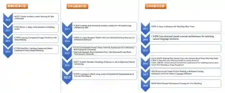 随着深度学习在计算机视觉、语音识别和推荐系统领域中的成功运用,近年来有很多研究致力于将深度神经网络模型应用于自然语言处理任务,以降低特征工程的成本。最早将深度学习应用于文本匹配的是微软 Redmond 研究院。2013年微软 Redmond 研究院发表了 DSSM [2],当时 DSSM 在真实数据集上的效果超过了SOTA(State of the Art);为了弥补 DSSM 会丢失上下文的问题,2014年微软又设计了CDSSM [3];2016年又相继发表了 DSSM-LSTM, MV-DSSM。微软的 DSSM 及相关系列模型是深度文本匹配模型中比较有影响力的,据了解百度、微信和阿里的搜索场景中都有使用。