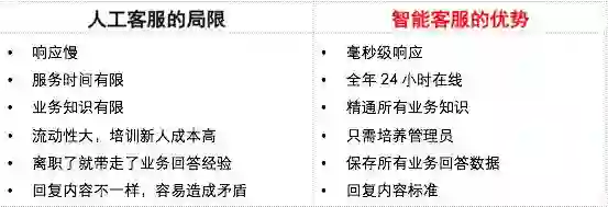 由于人工客服在响应时间、服务时间和业务知识等方面的局限性,有必要研发智能客服系统,使其通过智能化的手段来辅助人工客服为用户服务。智能客服与人工客服的优劣势对比如图 4 所示。