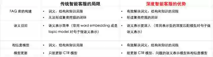 问题聚类、语义召回和相似度模型都可以归结为文本匹配问题。传统智能客服在这些模块中使用的是传统文本匹配方法,不可避免地会遇到词义局限、结构局限和知识局限等问题;加上传统文本匹配方法多是无监督的学习方法,那么由这些方法训练的模型就无法利用运营人员的反馈和用户的点击行为等知识。然而,使用深度文本匹配的方法则可以有效地解决这些弊端。具体改进方面如图 6 所示。