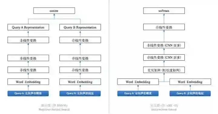 我们曾在智能客服的不同领域中尝试过多种深度文本匹配方法,通过业务场景推动技术演进的方式,逐淅形成了一套成熟的文本匹配引擎。我们的文本匹配引擎除了使用传统的机器学习模型(如话题匹配模型、词匹配模型、VSM等)外,还使用了基于表示型和基于交互型的深度文本匹配模型。