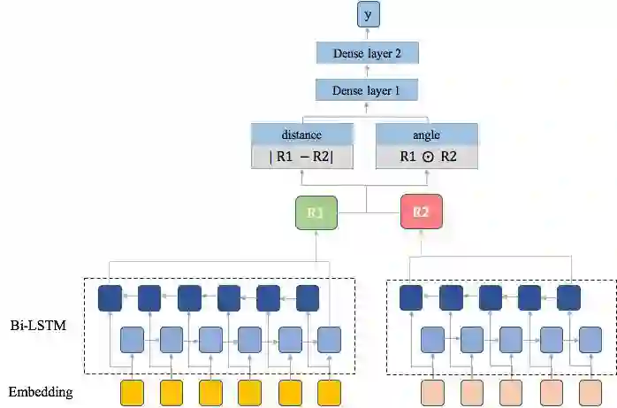 表示型的深度文本匹配模型能抽出句子主成分,将文本序列转换为向量,因此,在问题聚类模块,我们使用表示型的深度文本匹配模型对挖掘的问题和 FAQ 库的问题做预处理,方便后续增量聚类模块的计算;在语义召回模块,我们使用表示型的深度文本匹配模型对 FAQ 库的问题做向量化处理,并建立索引,方便问题召回模块增加对用户 query 的召回。另外,我们使用基于 Bi-LSTM 的表示型模型以捕获句子内的长依赖关系。模型结构如图 7 所示。