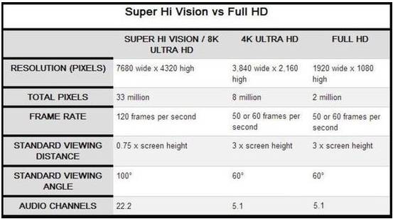 表面上看8K电视只是将4K电视3840×2160像素分辨率,提升到了7680×4320,提升了4倍,但这背后却需要画面帧率、标准观看距离、视角模式以及音频标准等整体技术的提升。