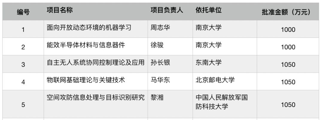 新智元也盘点了计算机、物联网、电子工程等相关的项目,南大周志华教授东南大学孙长银教授北京邮电大学马华东教授等获得创新研究群体项目资助。