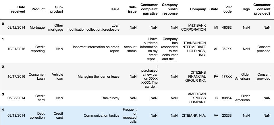 df.columns = ['Product', 'Consumer_complaint_narrative']