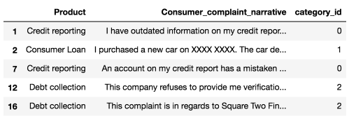 我们将删除「消费者投诉叙述」栏中的缺失值,并添加一列来将产品编码为整数,因为分类变量通常用整数表示比用字符串更好。