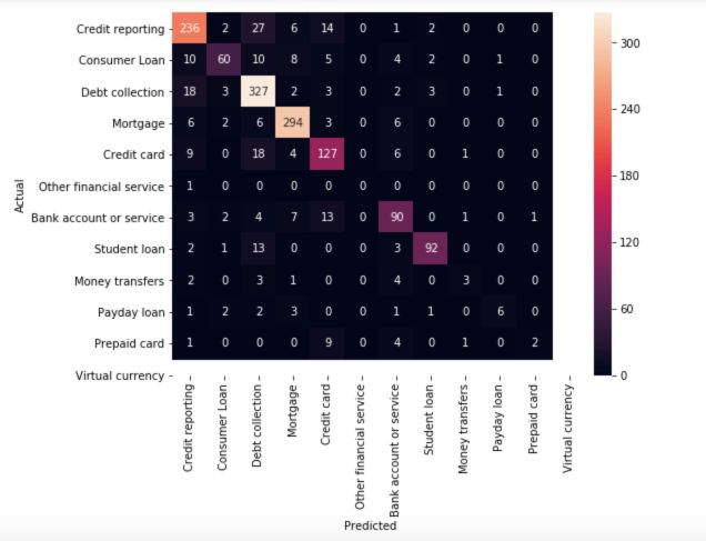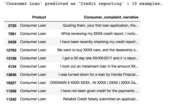 如你所见,一些错误分类的投诉涉及多个主题(比如涉及信用卡和信用报告的投诉)。这种错误总是发生。
