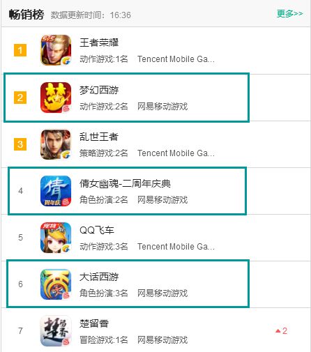 在5月16日的iOS游戏畅销榜单中,网易的三款手游《梦幻西游》、《倩女幽魂》、《大话西游》进入TOP6。如果说手游的强势进击可以看作是端游IP的再延续,那么,网易现在在做的则是将点连成面、织成网,逐步完善IP品牌。