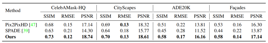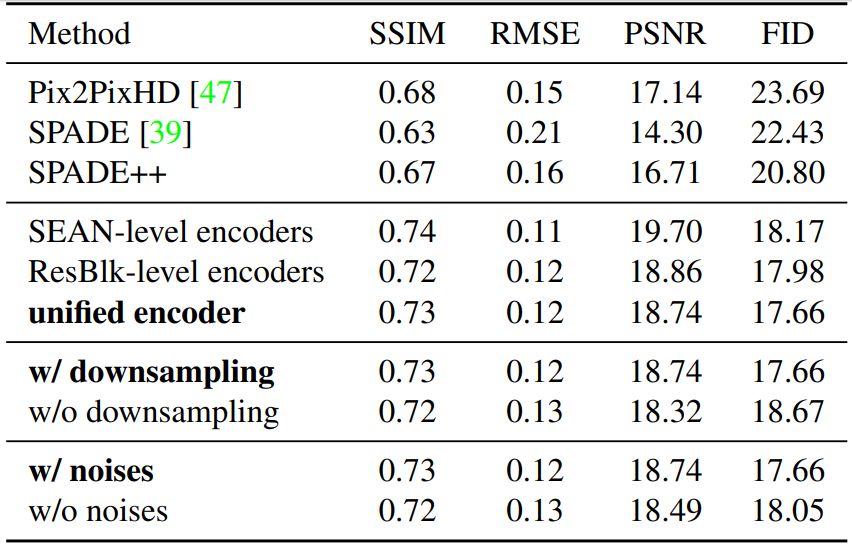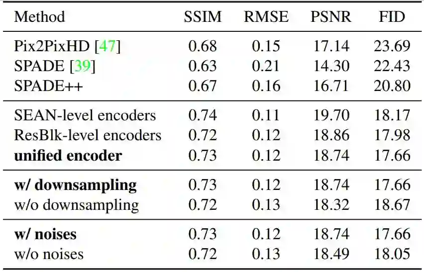 其次,SEAN 能改善每个区域的风格编码,使得重建的图像可以在 PSNR 和视觉观察指标上与输入的风格图像更相似;