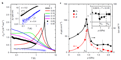图1:CePdAl中压力诱导量子临界相的产生。(a) 温度-压力相图和电阻率的温度指数。(b) 通过掺杂产生的化学压力表现出和静水压同样的结果,在量子临界相中具有发散的电子比热系数。(c) 电阻率的A系数和残留电阻对应两个临界压力,中间区域代表量子临界相。