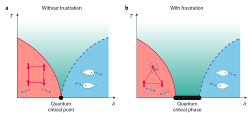 图2:非自旋阻挫体系中的量子临界点和自旋阻挫体系中的量子临界相的对比。