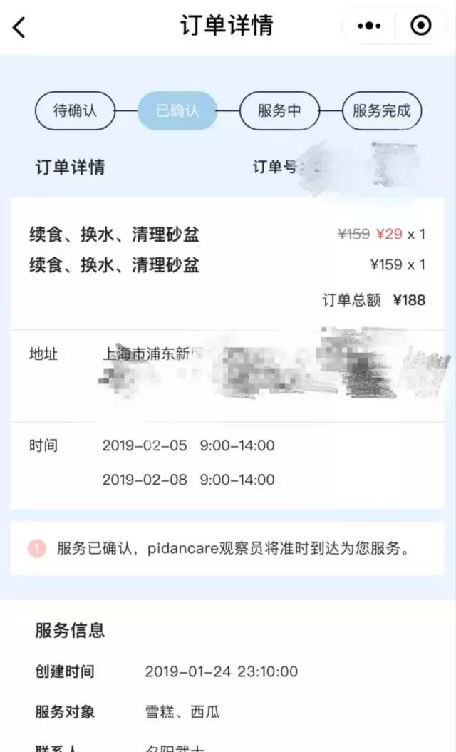 此时,远在数百公里以外的王璐也遭遇同样的问题。据她阐述,通过Pidan淘宝旗舰店上门喂猫的服务链接,王璐按照页面指引在其小程序上下了单,约定2月5日和2月8日上午9点至下午2点共两次的上门喂养服务,包括帮助猫咪续食、换水和清理猫砂盆三项服务,一次上门159元。