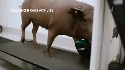 格特鲁德则仍然佩戴 Link 芯片,当饲养员给格特鲁德喂食并蹭了蹭它的鼻子时,身后的一块电脑屏幕就会显示出变化:它的神经元开始兴奋,也就是在响应人类的触摸动作。