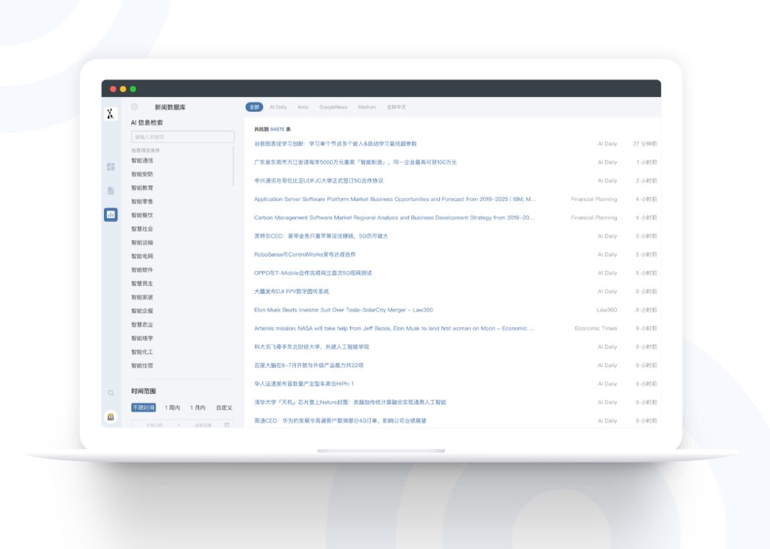 在新闻数据库中,1.0 beta 版本引入 5 类信息源:机器之心 AI Daily、arXiv、GoogleNews、Medium、全网中文,覆盖超过 3 年数万条的历史及实时新闻数据,帮助读者追踪技术动态与行业事件。