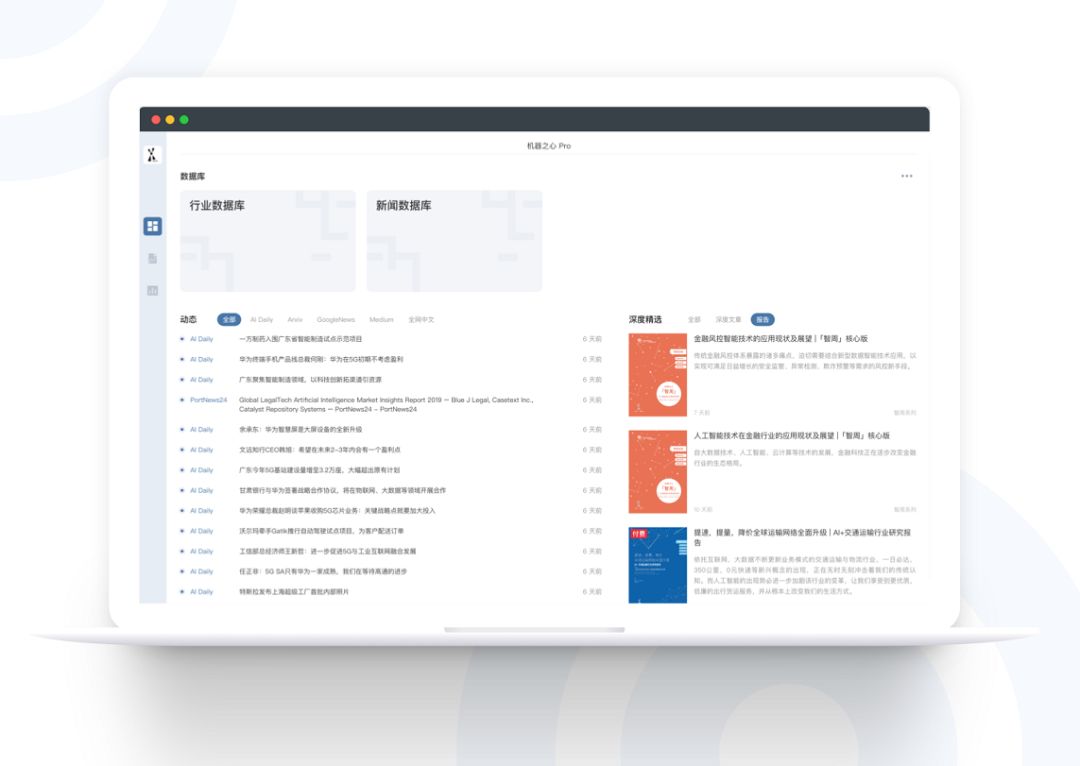 搭建的人工智能领域专业信息平台。1.0 beta 是「机器之心Pro」的首个测试版本,目前已上线dashboard、新闻数据库、行业数据库和深度精选 4 个模块,覆盖 38 个技术领域及 55 个智能应用领域,并将日日有更新、周周有优化、月月有惊喜。