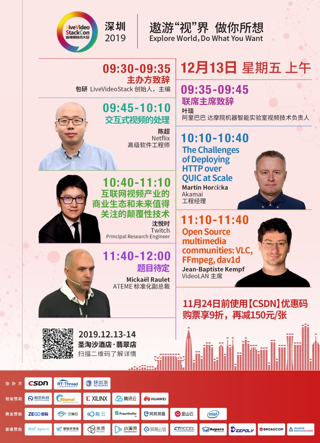 这里既有VideoLAN主席Jean-Baptiste Kempf分享《开源社区与VLC、FFmpeg、dav1d》,也有Twitch Principal Research Engineer沈悦时分享《互联网视频产业的商业生态和未来值得关注的颠覆性技术》,还有字节跳动IES多媒体音视频团队 视频算法方向技术负责人符乐安分享《视频编解码结合的画质增强和移动端优化》,哔哩哔哩资深开发工程师郑龙分享《SRT协议在互联网领域的实践》......