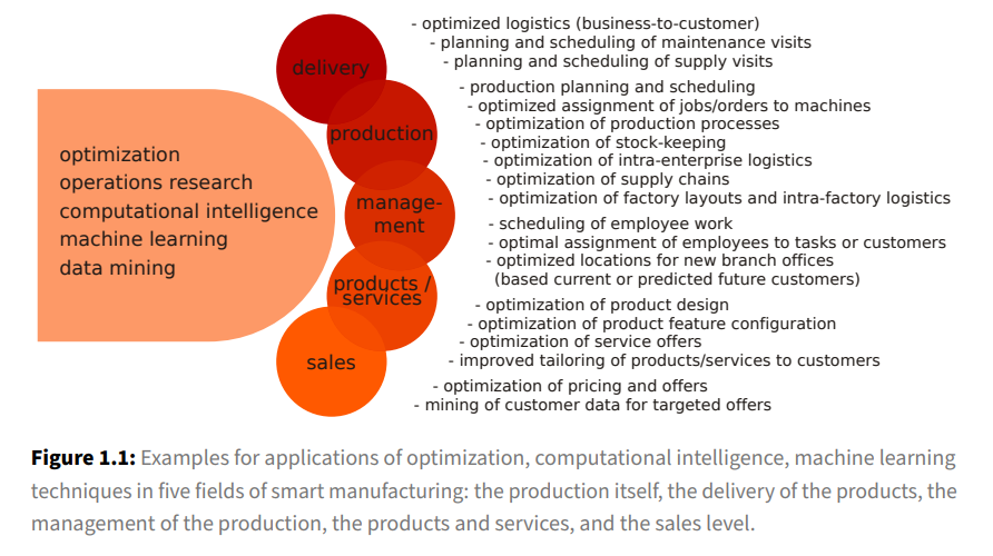 如今,算法对我们日常私生活和工作生活的影响越来越大。他们建议我们看有趣的电影或购买的产品。当我们开车时,它们帮助我们找到有效的路线,或者帮我们匹配附近下一辆可用的出租车。他们控制广告活动,并提出产品定价政策[151]。他们通过在工程、时间表和调度、产品设计和物流规划等多个领域提出良好的决策来支持我们。它们将是我们行业向智能制造和智能生产转型的最重要元素,它们可以自动化各种任务,如图1.1所示。