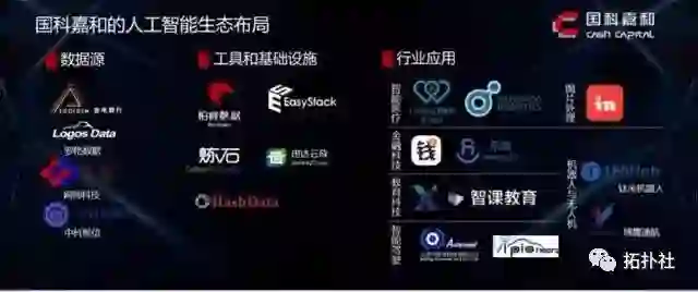 人人AI,真正创业的团队有哪些呢?可以看到有掌握数据的团队、掌握算法的团队和做应用场景应用的团队。数据团队是做食材,算法团队可以比喻成菜刀,应用场景就是大师傅准备上菜了。基本上这个行业就是食材、菜刀、上菜,这样一来整个行业全景就看清楚了。国科嘉和在数据源、工具、基础设施以及行业应用上都有自己的投资布局。