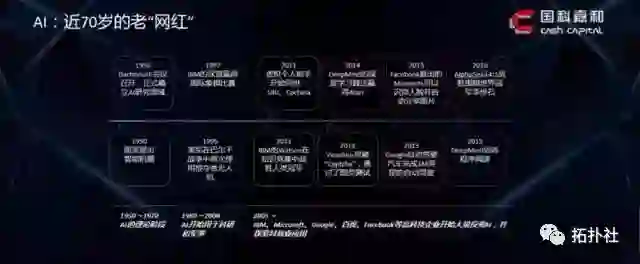 其实人工智能本身是“70岁的老网红”,为什么这么说呢?因为AI本身就具有一段历史,时间有限,在此就不详细展开了。