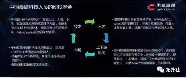 中国科学院是国家的战略科学力量,我们贡献了国家20%的专利权,100多个是研究院所,5万的博士,450个院士。国科嘉和基金是中科院的一级投资平台,直接投资创业项目,目前管理资金在740亿。我们从1千万起投,投到单个案子大概5个亿左右。