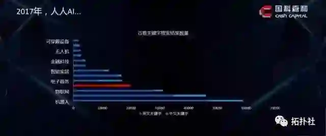 现在人人谈AI。讲个今年的实际现象,我们一年要看大概2400个项目,然后有一个总结,一小时谈话分三个阶段,第一个阶段说干了什么事;差不多第二个阶段到了,谈大数据;最后一个阶段一定谈人工智能。现在如果不谈人工智能,在这个圈里都不好意思来融资。图中AI这个搜索统计也可以作为一个佐证。