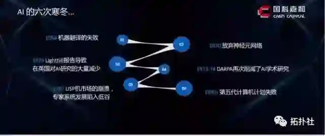 人工智在过去的60年70年经历了几个大波的寒流,一波一波起来,然后再一波一波下去,此图基本上是我们看到的整个的人工智能的情况。所以这块我也不展开了,大家有兴趣可以到网上查一查就很清楚。