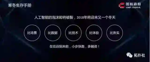 如果你现在还在做人工智能创业,我建议是赶紧小步快跑,先拿一部分钱放手里是最佳选项。等到2018年6月份以后没人看了,这个时候比谁有棉袄、谁有粮草、谁能存活下来。