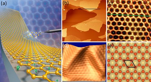 图1:(a) 利用超高真空分子束外延(MBE)的制备方法在Al(111)衬底上制备出蜂窝状结构硼烯的示意图(Science Bulletin 封面图);(b)(c)(d) Al(111)衬底上硼烯薄膜的扫描隧道显微镜(STM)图,其中d图显示出三角形的周期性起伏结构;(e) Al(111)衬底上硼烯薄膜的原子结构模型图。