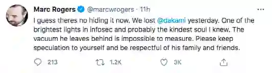 他是一个黑客中的黑客,是你希望在你身边的人。听到这个消息,我非常难过。」