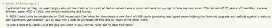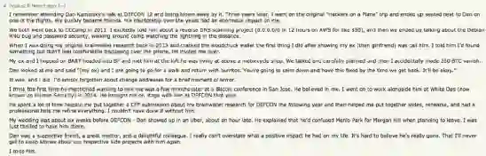 「我将非常想念他。他是那个在Defcon大会上让我在他的房间里睡觉的人,当时我还是个未成年人,太小了,不能自己订房间。这拉开了20年友谊的序幕。他才华横溢,爱说爱笑,注意力不集中,而且总是令人喜爱,充满爱心。