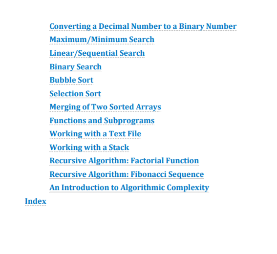 主要的算法有:循环中三个或n个数字的和、十进制到二进制的转换、最大和最小搜索、线性/顺序搜索、二进制搜索、冒泡排序、选择排序、两个排序数组的合并、从文件中读取字符、堆栈管理、阶乘和斐波那契序列。