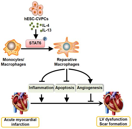 图:hESC-CVPCs对急性心肌梗死的修复作用。hESC-CVPCs通过旁分泌IL-4与IL-13,激活巨噬细胞STAT6并促进巨噬细胞向修复型极化,从而调节急性心梗后炎症反应,减少心梗后心肌细胞凋亡,增加血管新生,并改善了心脏功能。