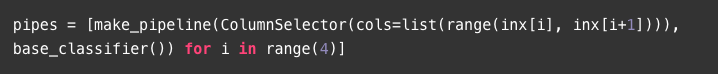 我们将使用功能强大的mlxtend扩展库,使stacking算法变得更加容易。对于四个基本分类器中的任何一个,我们都构建了一个可以选择适当特性的传递方法,并遵循LogisticRegression算法的途径。