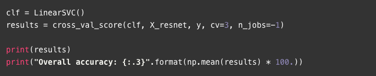 当模型被创建时,使用preprocess_input函数对初始训练数据(ImageNet)进行规范化,即求出平均信道像素值的减法结果。ResNet50.predict进行实际转换,返回代表每个图像大小为2048的向量。当首次被调用时,ResNet501d[1]的构造器会下载预训练的参数文件,所需时间长短取决于您的网速。之后,用这些特征向量和简单的线性SVM分类器来进行交叉验证过程。