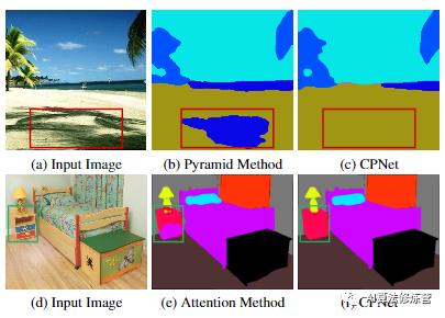 图1:语义分割中很难分割的情形示例。在第一行中,红色方框中的sand的中心部分被误分类为大海,因为阴影部分的外观与大海相似。使用基于金字塔的聚合方法,混淆的空间信息的聚合可能导致不良的预测,如(b)所示。在第二行中,绿色框中的桌子的外观与床的底部相似。基于注意力的方法在没有先验知识的情况下无法有效地区分混淆的空间信息,从而导致预测结果不正确,如(e)所示。在作者提出的CPNet中,以清晰的区分方式聚合了上下文相关性。值得注意的是,上下文先验将类内和类间关系建模为上下文先验知识,以捕获类内和类间上下文相关性。