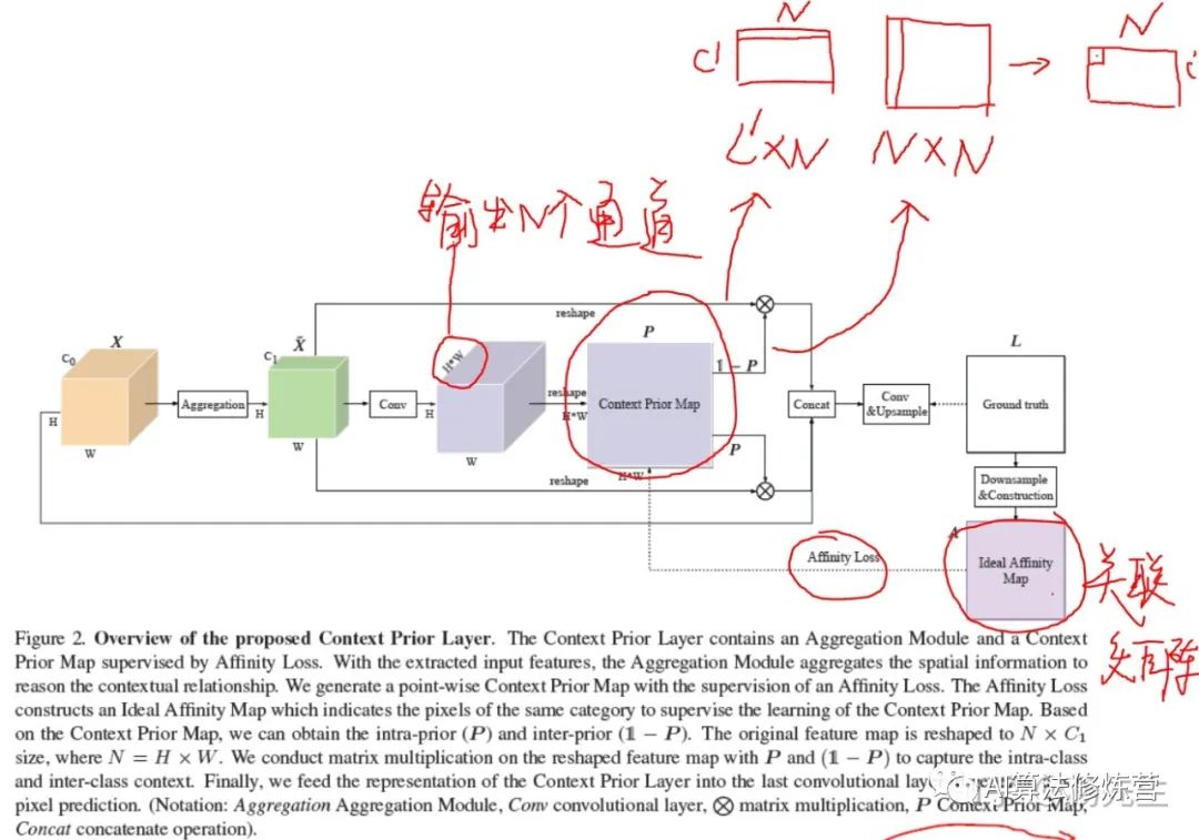 图2:上下文先验层(Context Prior Layer)概述。上下文优先层包含一个聚合模块和一个由亲和力损失(Affinity Loss)监督的上下文先验特征图(Context Prior Map)映射而成。利用提取的输入特征,聚集模块聚集空间信息以建立上下文关系。我们在亲和度损失的监督下生成point-wise的上下文先验映射。根据亲和度损失构建了理想的亲和度图(Ideal Affinity Map),用来指示相同类别的像素,以监督对上下文先验图的学习。