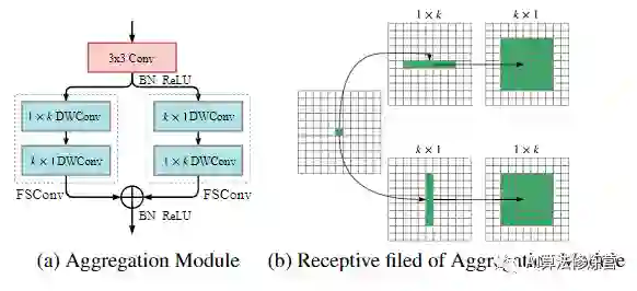 图4:聚合模块及其感受野的示意图(a)使用两个不对称的完全可分离的卷积来聚合空间信息,其输出具有与输入特征相同的通道。(b)聚集模块具有与标准卷积相同的感受野大小,但是计算量减少了。