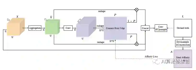 作者设计上下文先验层(Context Prior Layer),它可以在任何backbone的最后插入以进行语义分割的任务。Context Prior Layer使用backbone如resnet50输出的特征图(图中最左边的黄色立体)作为输入。经过聚合模块(Aggregation)聚合局部上下文信息之后,送入一个卷积层与sigmoid层进行处理,最后进行reshape得到了Context Prior Map。Context Prior Map由ground truth产生的Ideal Affinity Map进行监督,学习得到了类内的上下文信息并与经过聚合后的特征图相乘后得到富含类内上下文信息的特征图。与此同时,用1-P得到可以得到类间上下文,同样的操作可以得到富含类间上下文信息的特征图。将类间、类内、原图进行concat后上采样,便得到了预测图。