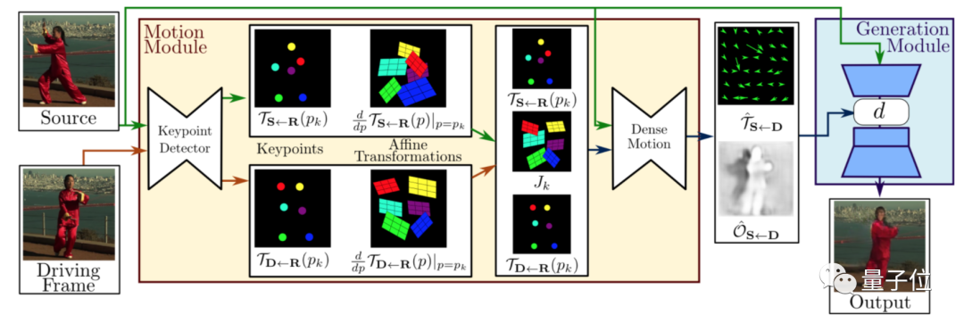 在第一步中,研究人员从稀疏轨迹集近似这两种变换,通过使用以自监督方式学习的关键点来获得。利用局部仿射变换对每个关键点附近的运动进行建模。