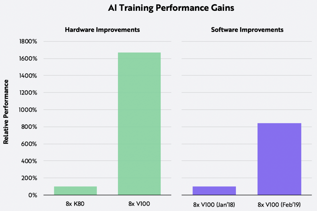 在2018年至2019年间,由于麻省理工学院、谷歌、 Facebook、微软、 IBM、 Uber 等公司的软件创新,V100的训练性能提高了大约800% 。