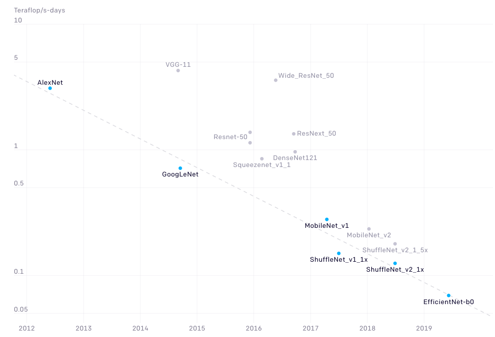 自 2012 年以来,人工智能模型在 ImageNet 分类中训练神经网络达到相同性能所需的计算量,每 16 个月减少了 2 倍