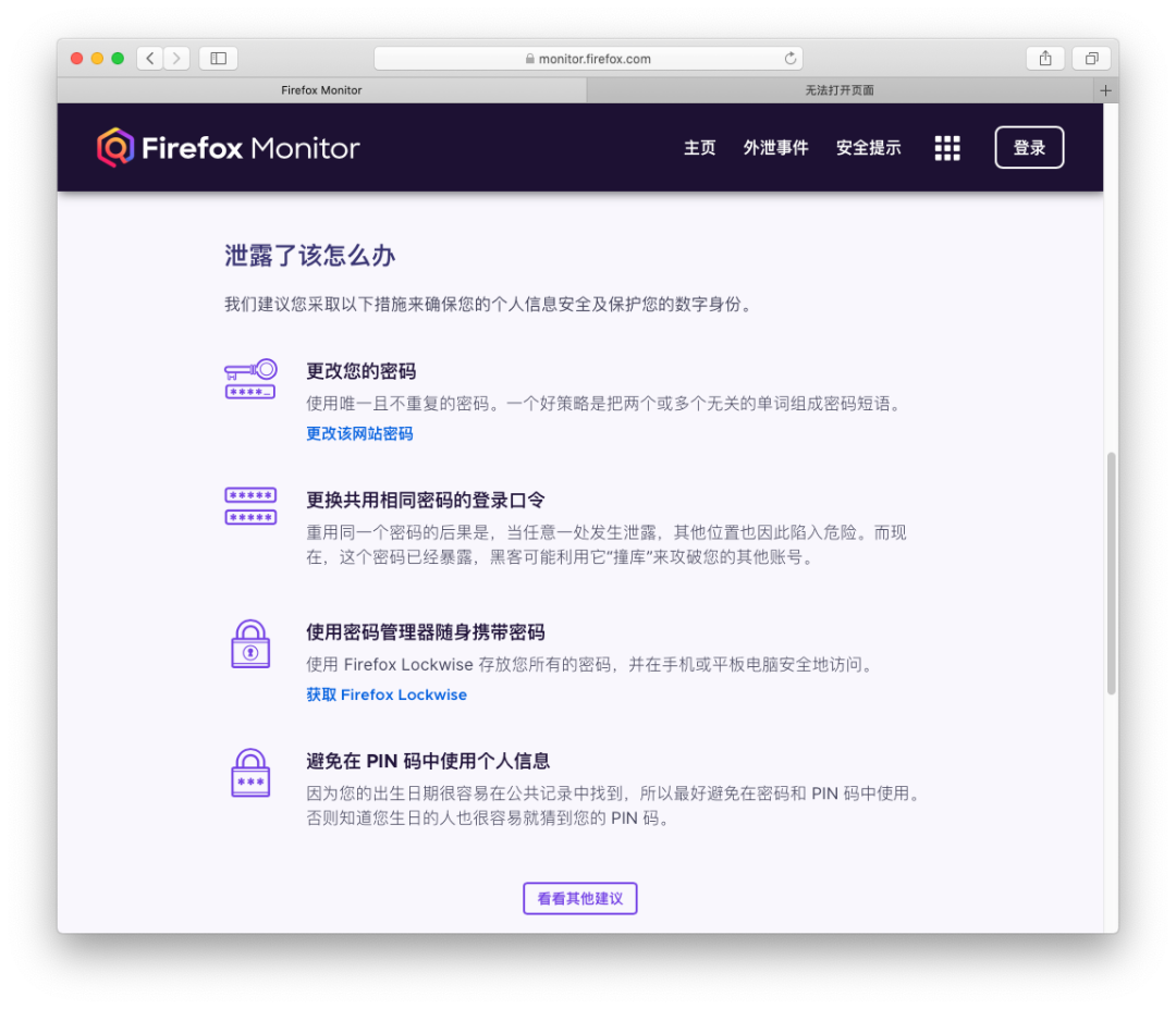 Firefox Monitor 还会很贴心的给出泄漏后的一些建议,如