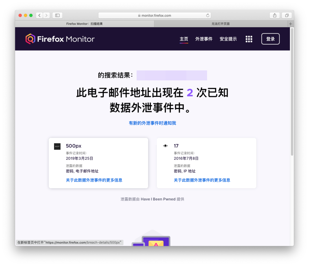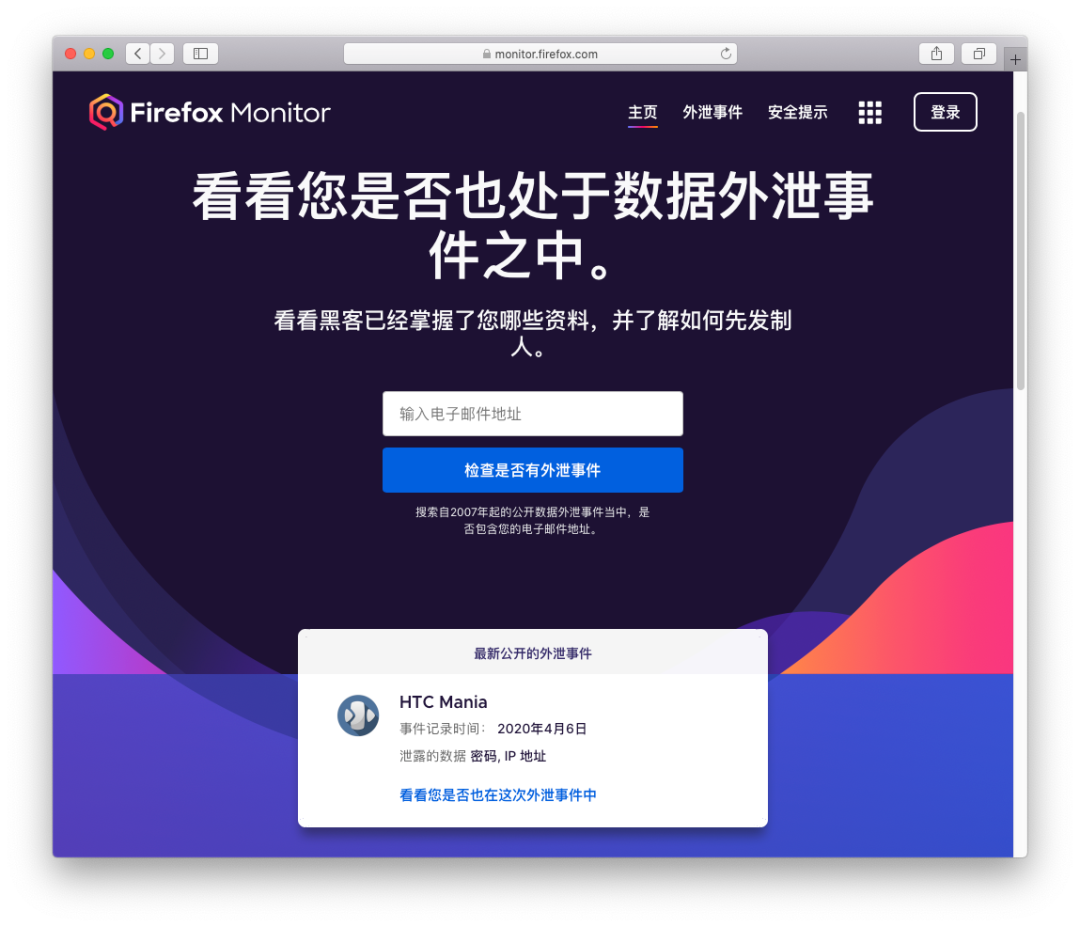 通过邮箱查询的推荐 Firefox Monitor,Mozilla 出品,只需要在搜索框输入电子邮箱,就可以查询自 2007 年开始所有公开数据泄漏事件当中,有没有包含你的电子邮件。