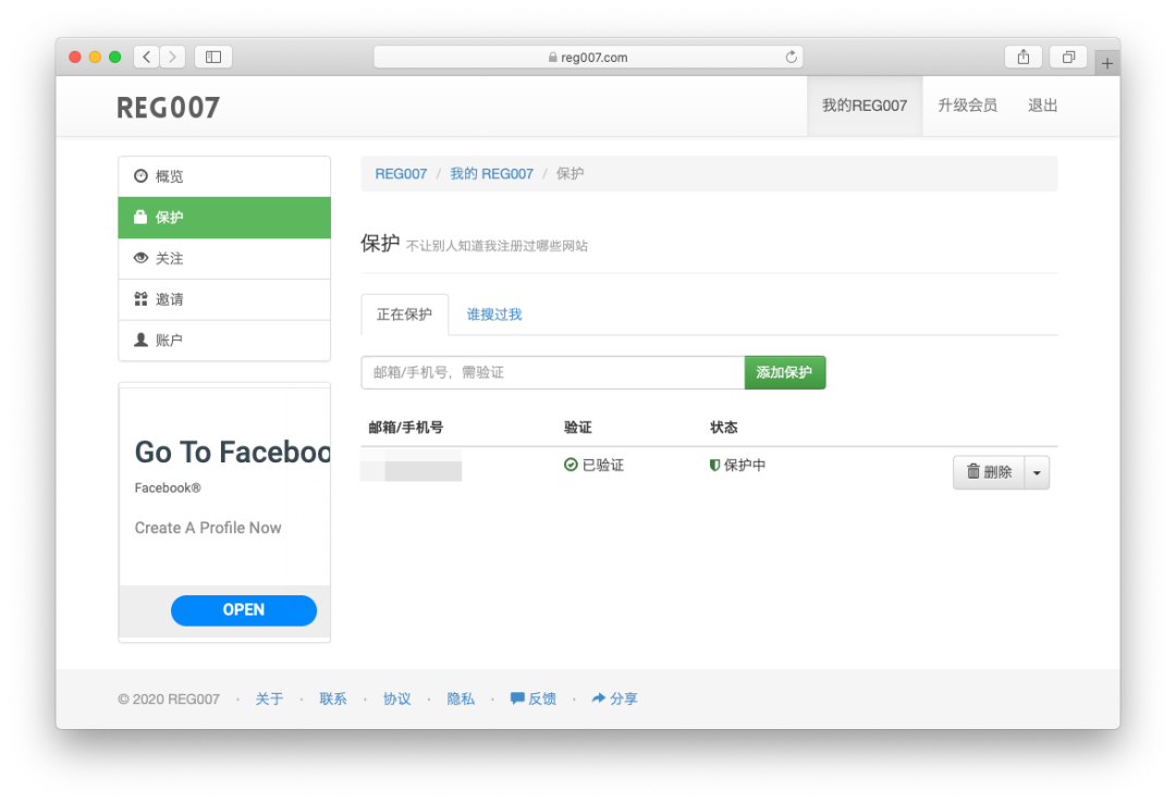 不过 REG007 的缺点也很明显:一是查询不需要验证码,这就意味着别人拿到你的手机号也可以查询你注册过哪些 App 和网站,所以需要在保护选项中开启“不让别人知道我注册过哪些网站”的选项;